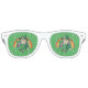 Sunglasses with an Illustration of a cute smiling leprechaun wearing a green suit, a top hat while holding a shamrock leaf, with a colourful rainbow in the background