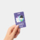 Name badge with a whimsical image of a unicorn and bird. This pair is happily smiling while hanging out together. A little heart hovers above their head. Unicorn is white with angel wings and a pink horn. The bird is a greenish blue colour wearing a black toque with black kitty cat with ears. A blue cloud placed behind these happy best friends.