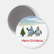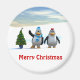 Two cute cartoon penguins happily standing by a Christmas tree in the snow. The boy is wearing a stocking cap and scarf and the girl has a red bow on her head.
