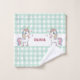 This personalised girls' wash cloth features a teal gingham pattern with two cute cartoon unicorns with vibrant rainbow-coloured manes and tails, big sparkling eyes, and golden horns.
