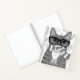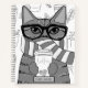 Adorable kitty wrapped in scarf, wearing glasses and holding coffee on personalised notebook.