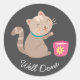 A cute cartoon of a cute cat with teacup design with a modern colourful illustration cartoon suitable for a student. Cute cat theme. Well done sticker for a teacher.