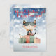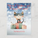 Cute cat christmas gift on blue background. Winter tree and snowflake.
