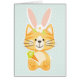 How purr-fectly cute is this cat Easter card? Customise the inside to say whatever you want. A sweet yellow tabby cat wears a pair of bunny ears with a daisy on it while holding a carrot in his hand. An aqua blue and white polka dot background on the front of the card and a light yellow and white polka dot background on the inside of the card. Artwork © Chrissy H. Studios, LLC. All rights reserved.