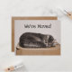 Cute grey tabby cat sleeping on a cardboard box moving flat card. 'We've Moved' phrase on front. Brown texture on back of card. Beautiful cosy sleepy pet. Trendy adorable kitty. Modern, chic, stylish. Image copyright Marg Seregelyi Photography.