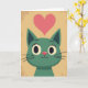 This Valentine's Day card shows a stylized cat’s head in deep teal sitting in the lower part of the design. The cat has big, wide eyes with black pupils and light cream irises, plus small lashes that make it look sweet and curious. Its tiny pink nose and slight smile give it a friendly, gentle expression, with thin whiskers stretching out from both cheeks. Above the cat, a soft pink heart floats near the top center, standing out against a warm sandy beige background. There isn’t any text on the card, so the heart and the cat do all the talking in a simple, romantic way. A light grainy texture covers the whole image, making it feel a bit like printed paper rather than a flat screen graphic. The teal and pink colors contrast nicely and keep the focus on affection and warmth ❤️💌🍫.