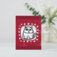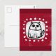 A cute drawn cat in black and white over a red textured background surrounded with white dots.