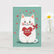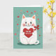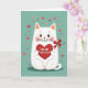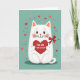 This card features a chubby white cat centered on a soft teal background. The cat has big black eyes, a small smile, and pink blush on its cheeks that makes it look a little shy. It’s holding a large red heart close to its body, like a warm hug. On the heart, the text says “YOU ARE PURR-EFFECT!” in bold white block letters, standing out clearly in the middle. A red bow sits near the top of the cat’s head, matching the heart. Small hearts in red and coral, some filled in and some outlined, float around the cat to fill the space with love ❤️💌🍫. It feels sweet and caring, and it’s great for sharing Valentine’s Day sentiments.