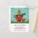 Christmas save the date postcard with an image of a adorable orange cat sitting in a teacup. Wearing warm winter clothing. Snowflakes falling against a light green background. Christmas tree border along the bottom.
