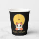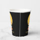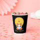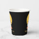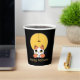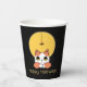 This paper cup features a cute cat with eyes upturned to a spider wearing a witch's hat, dangling in front of a golden moon. This is a whimsical Halloween design appropriate for children of all ages. Search ID865 to see other products with this design.