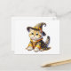 tep into a world of magic and cuteness with our Adorable Wizard Kitten Halloween Greeting Postcard! This charming postcard features a cartoon tiger cat, dressed in a whimsical wizard outfit complete with a cape and witch hat, ready to cast a spell of joy.