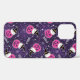A phone case with an adorable Halloween themed pattern. Cats in witches hats, sitting on pink pumpkins with purple cobwebs in the background.