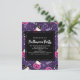 Halloween party invitation with an adorable Halloween themed pattern. Cats in witches hats, sitting on pink pumpkins with purple cobwebs in the background.
