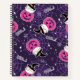 A personalised spiral notebook with an adorable Halloween themed pattern. Cats in witches hats, sitting on pink pumpkins with purple cobwebs in the background.