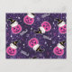 Hello postcard with an adorable Halloween themed pattern. Cats in witches hats, sitting on pink pumpkins with purple cobwebs in the background.