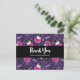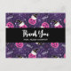 Thank you postcard with an adorable Halloween themed pattern. Cats in witches hats, sitting on pink pumpkins with purple cobwebs in the background.