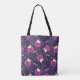 A tote bag with an adorable Halloween themed pattern. Cats in witches hats, sitting on pink pumpkins with purple cobwebs in the background.
