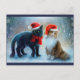 Too festive cat's ready for winter snow background with Santa hats and scarf.