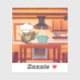 An illustration of a cute cartoon chef owl cooking in the kitchen using his favourite teal coloured pot, chef hat and wooden laddle. This adorable bird design is a gift idea for food lovers and animal lovers.
