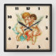 A square clock with 2 cute little cherub angels with soft white wings, one whispering to the other. Set on an old looking faux parchment background.