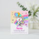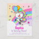 Cute Chibi Unicorn Birthday Party Postcard Invitation. Pastel coloured smiling unicorn holding a cupcake and balloons floating up over a cloud and past a rainbow with stars and moons. Perfect for your little girls next birthday party!