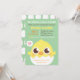 The little one is about to hatch! Celebrate with mummy to be before the big hatch day! This baby shower invitation has a cute little yellow chick hatching from an egg. On the reverse is a egg pattern with the little chick among all the eggs. A simple yet adorable invitation using colours of yellow, orange and brown. Background colour can be changed in customisation mode. Great for baby showers held in the spring April period! Personalise with your baby shower details.