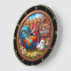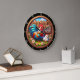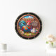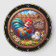 This vibrant wall clock features a colourful rooster and a small white chick standing in a garden of pink flowers, in front of a wooden fence. A sign reads "CUTE CHICK AND AN OLD ROOSTER LIVE HERE." The bright, cheerful design makes it a charming piece for any home.