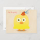 Light colour greeting card with cartoon of cute little chicken with red and yellow polka dot party hat and customisable message. Message currently is "Join the party!". Suitable as a invite for a party celebration like baby shower or as a happy birthday postcard for friends and family.