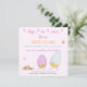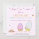 NewParkLane - Personalised Easter Egg Hunt Invitation, with 'Hop on over' in a cute typography with butterflies, two cute Easter chicks just hatched out of their egg shells in pastel pink and purple and one in soft blue. With a cute little orange and a pink butterfly, and cute little pastel coloured flowers.