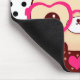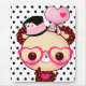 Cute chocolate bear wearing heart-shaped pink glasses and Mat Hatter Hat with lovely balloon on black polka dots.