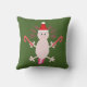 This awesome patterned outdoor pillow features a digital art image of a cute Christmas Axolotl. The Axolotl is pale pink with bright pink gills. It is holding a red and white striped candy cane in each hand and is wearing a festive Red and white Santa hat. The axolotl is type of Salamander from Mexico. A larger version of the design is also on the back of the pillow.