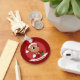 Keychain with an illustration of a cute smiling happy baby girl or boy, the baby is wearing red and white clothes and holding a present; with editable text template for your name or message, Christmas holidays design with a red background