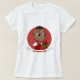 Women's T-shirt with an illustration of a cute smiling happy black baby girl or boy, the baby is wearing red and white clothes and holding a present; with editable text template for your name or message, Christmas holidays design