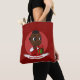 Tote bag with an illustration of a cute smiling happy black baby girl or boy, the baby is wearing red and white clothes and holding a present; with editable text template for your name or message, Christmas holidays design with a red background