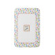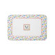 Cute Christmas balls and gifts pattern, monogram bath mat. It showcases a border of Christmas gifts and ornaments and your monogram on white.