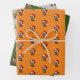 Cute cartoon Christmas beaver wearing a santa hat and a cute beaver couple with trees in the background on wrapping paper sheets with orange, green and gray background.