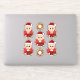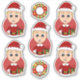 Set of seven cut-vinyl stickers with an illustration of a cute little happy smiling boy with short blonde hair, who is dressed in Christmas clothes and is wearing a red Santa Claus hat, on a red background; five stickers of the boy and two stickers with a Christmas wreath