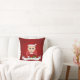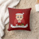 Throw pillow with an illustration of a cute smiling caucasian boy with short ginger hair, the boy is wearing a Santa Claus costume with a red hat and holding a present; in a red circle on a red background, a Christmas holidays cartoon design with an editable text template for your name or message