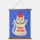 This awesome Christmas wood topped wall tapestry features a digital art image of a cute Christmas Siamese Cat with beautiful blue eyes, brown claws, ears and whiskers and its front paws raised in the air. The cat is wearing a red collar with pretty white snowflakes on it and a beautiful golden bell. The cat is wearing a warm red bobble hat with white snowflakes on it to keep it warm in the winter cold. There is custom text so you can include a message.