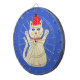 This awesome dart board features a digital art image of a cute Christmas Siamese Cat with beautiful blue eyes, brown claws, ears and whiskers and its front paws raised in the air. The cat is wearing a red collar with pretty white snowflakes on it and a beautiful golden bell. The cat is wearing a warm red bobble hat with white snowflakes on it to keep it warm in the winter cold.