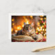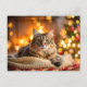 Cute cat lounging on a cosy Christmas blanket in front of a fireplace. The fireplace glows softly with evening light, and the background has a subtle bokeh effect from holiday lights. Holiday Postcard