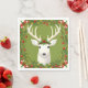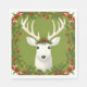 Detailed illustration of a deer with antlers in a serene, snowy landscape featuring greenery and mushrooms.