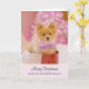 Greeting card with an adorable Christmas dog wearing a cute pink plaid bow tie. This tiny little pet is sitting inside a whimsical hat box. A white tree decorated with pink lights in the background. The lights are blurred giving it a magical bokeh effect. Darling Christmas themed photograph. Perfect for dog lovers.