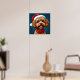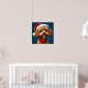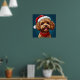 Cheerful, fluffy dog wearing a festive red Santa hat with white trim and a matching red scarf around its neck. The dog's curly fur is a warm, golden-brown colour, and its large, expressive eyes convey a sense of joy and playfulness. The background is a deep blue, which enhances the vibrant colours of the dog's accessories. Overall, the image has a whimsical and festive feel, perfect for the christmas holiday season.