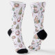 These Christmas socks would be an adorable addition to your wardrobe for the festive season. The pattern features elves, Santas, Christmas trees, ornaments, gifts, candy canes and gingerbread houses on a white background.