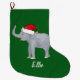 This beautiful Christmas elephant stocking features a beautiful smiling elephant wearing a red Santa hat with a raised trunk. This pretty personalised animal Christmas stocking is decorated with a lovely green holiday background. Personalise with your own text at the bottom for a classy gift.