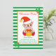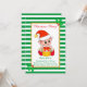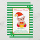 Cute Christmas elf dressed in red on green and white striped background Christmas party invitation. Cute baby elf holding a gift box on white and green background. Text is ready to be personalised.