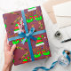 A cute pattern of Christmas elves with giant green and red Christmas hats and elf shoes, blue snowflakes and gold stars, on a plum coloured background. This elf wrapping paper would certainly add a festive finishing touch to your gift wrapping these Christmas holidays.