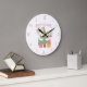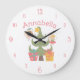 This custom wall clock features a cute, pastel winter holiday theme. An image of a whimsical Christmas tree is pictured at the bottom, with two little fairies flying around it. A beautifully wrapped present is pictured beneath each fairy. A sample name is printed at the top in a pretty pink font, which you can personalise to include your own custom name or text. The hours are printed in a matching font around the clock.