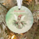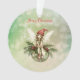 A cute fairy wearing a red cap sits on a green Christmas ornament decorated with holly leaves and berries while snowflakes swirl around her. The words “Merry Christmas” can easily be changed to any greeting you prefer and the back can be personalised as well.